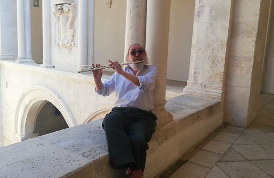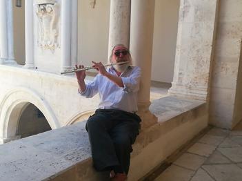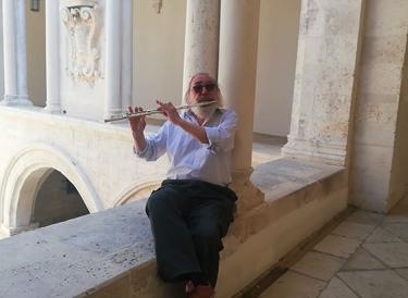 Umirovljeni profesor i glazbenik Jakov Kakarigji vrijeme izolacije provodi svirajući flautu u Dvoru i ispred njega.